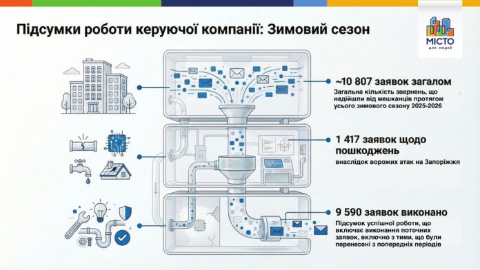 Керуюча компанія «Місто для людей Запоріжжя» оприлюднила підсумки роботи впродовж зимового періоду 2025–2026 років. За інформацією підприємства, сезон проходив в умовах підвищеного навантаження на житловий фонд через обстріли, перебої з електропостачанням та зношеність інженерних мереж.